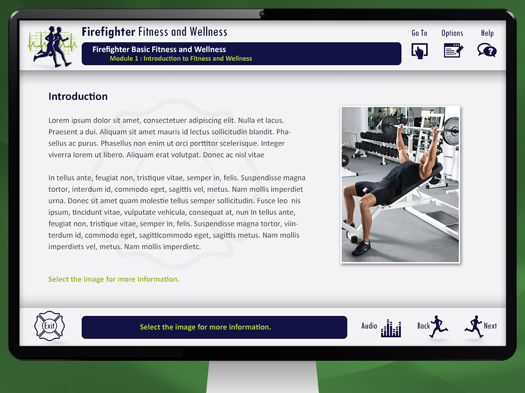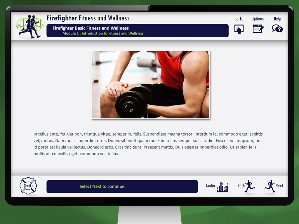 I designed and developed this award-winning interface that received the "Horizon Interactive Bronze Medal Award in the category of Training/e-Learning Websites" for the "U.S. Air Force: Firefighter Fitness and Wellness Training Program" (web-based training program). This design was chosen out of several design entries within the creative team department.