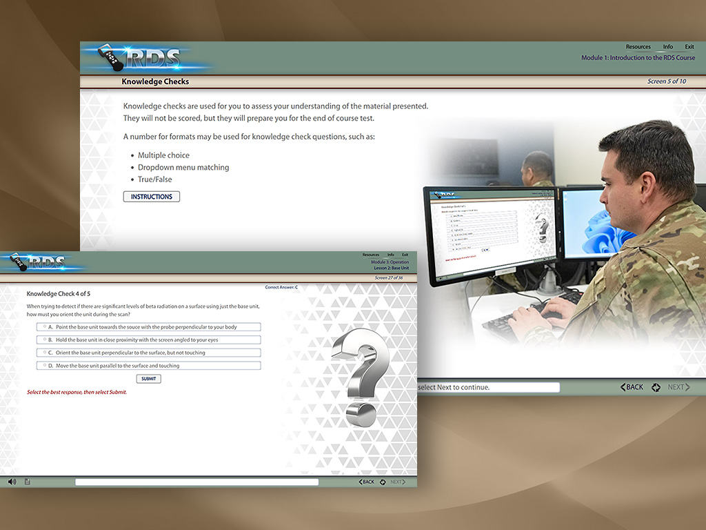 This Radiological Detection System (RDS) Training was designed and developed for the Air Force Civil Engineer Center (AFCEC). This training course is one in a series of courses developed for AFCEC.